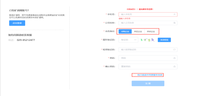 1.4填写信息,按需选择入驻身份,浏览矿道网服务条款后点击同意,点击注册按钮即可成功注册