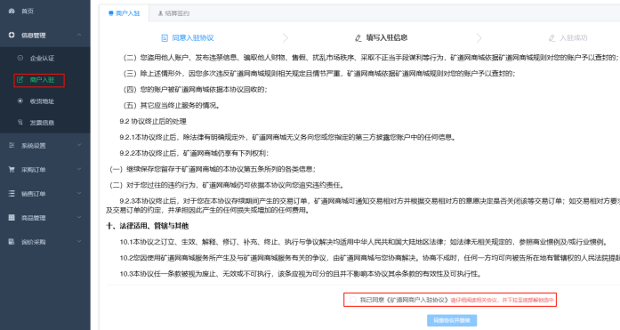 3.1点击商户入驻,浏览完入驻协议后勾选同意,点击同意协议并继续按钮