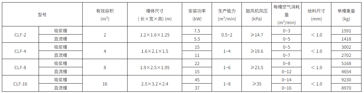 CLF型充气搅拌式浮选机叶轮采用了后倾叶片叶轮,下叶片形状设计成与矿浆通过叶轮叶片间的流线相一致,具有搅拌力弱,矿浆循环量大,功耗低,与槽体和格子板一起能充分保证粗粒矿物的悬浮及空气分散。CLF型充气搅拌式浮选机提供了良好流体力学条件,提高了矿化气泡的负载能力和被浮选的磨矿的粒度。