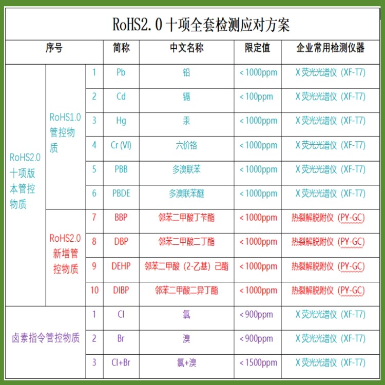 2、RoHS2.0标准:Pb铅、Cd隔、Hg汞、PBB\PBDE溴、 Cr铬、DEHP、DBP、BBP、DIBP